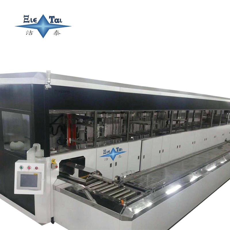 潔泰龍門臂超聲波清洗機,是一款全自動,清洗過程由微控控制,5個由SUS316材質(zhì)制作的清洗槽,漂洗槽、烘干槽組成的一條連續(xù)工作的裝置。操作者將裝有工件的清洗籃放置在進(jìn)料輸送滾道上,輸送滾道將清洗籃送往上料工位,機械手依次將清洗籃送往各清洗槽,對工件進(jìn)展熱浸洗、超聲粗洗、超聲精洗、蒸汽浴洗及熱風(fēng)烘干,第一到五槽的熱浸洗、超聲波粗洗、超聲波精洗、蒸汽浴洗、熱風(fēng)烘干過程中,清洗籃旋轉(zhuǎn)機構(gòu)使清洗藍(lán)始終處于旋轉(zhuǎn)狀態(tài),使工件充分得到清洗,提升過程中洗籃也始終處于旋轉(zhuǎn)狀態(tài),并在冷凍區(qū)停留一段時間,使清洗液脫離工件流回清洗槽,工件橫移機構(gòu)負(fù)責(zé)將工件挪動一個工位,出料輸送滾道將清洗好的工件送往出口,操作者在出口處將工件卸下,翻開洗籃將工件道入器皿,清洗既告完成。